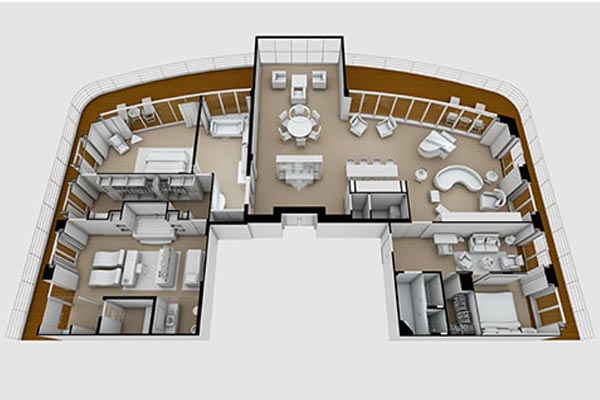 Incomparable craftsmanship and meticulous attention to detail are evident everywhere – from the suite’s unique design choices, such as rare works of art, to grand features like an in-suite spa retreat and Steinway piano. The only thing to rival the luxurious interior that includes two magnificent bedrooms is the spectacular ocean view from private balconies that include a Tresse Minipool high atop the ship.